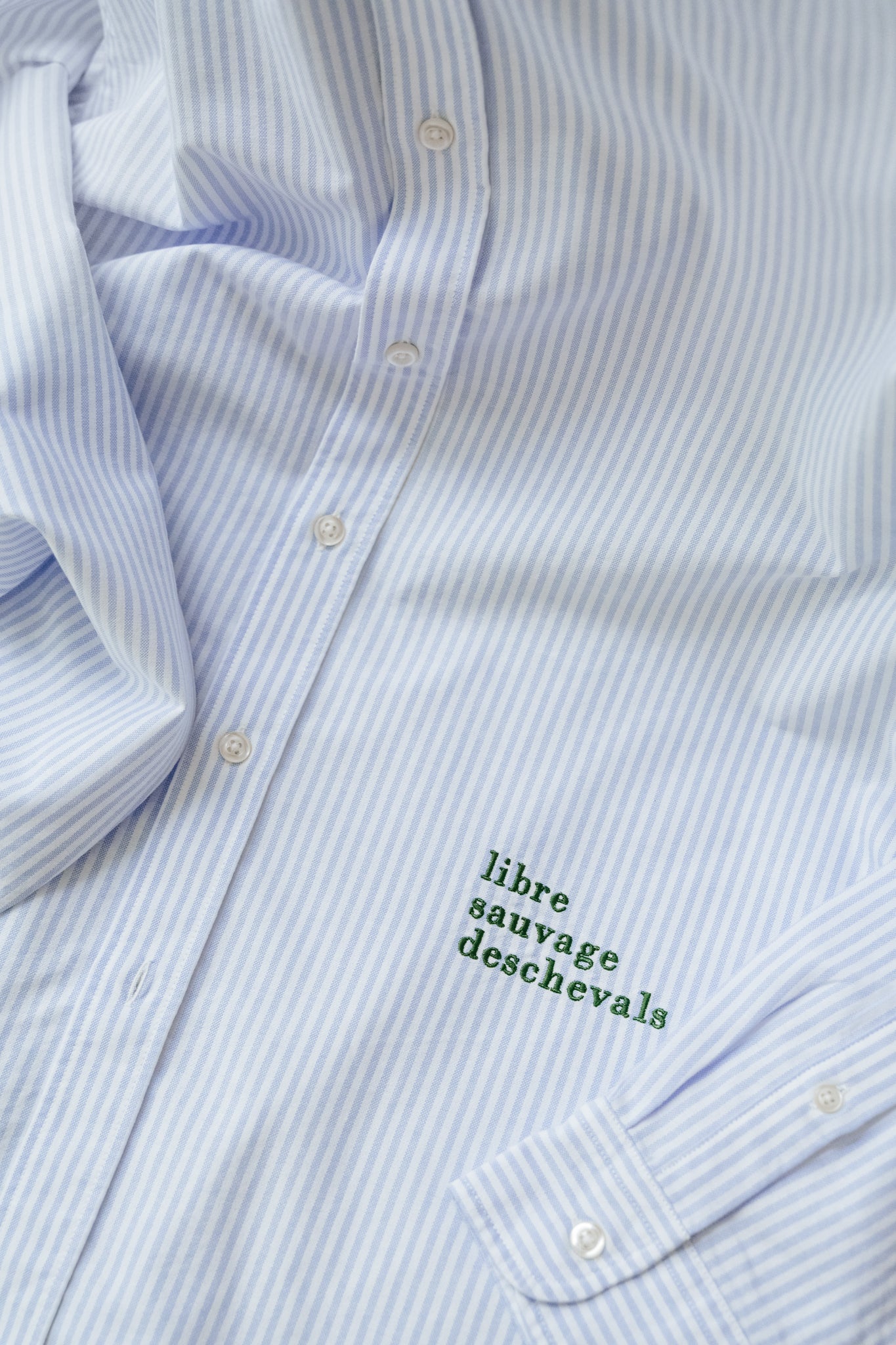Élégante et intemporelle, cette chemise Oxford rayée blanc et bleu clair est confectionnée en 100% coton.